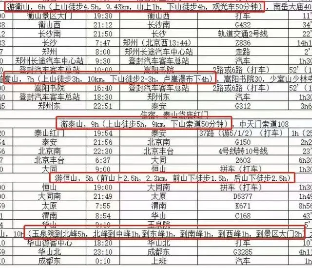 有些高中学校已经给出一个学生一天的时间大框架,但如果想获得更好的成绩,还需要在这些大框架上,作出调整。2023年五一假期,一个四川成都的年青人,5天爬完五岳(泰山、华山、衡山、嵩山、恒山),还有一张周密计算出行时间路线攻略图(见下图):
