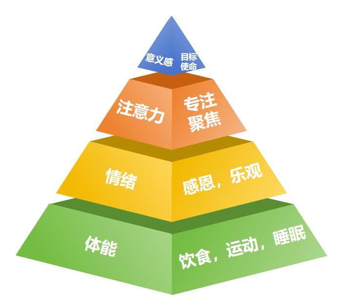 有了学习目标,规划了自己的日程表,及进行了细致的时间管理,接下来就是如何高效学习。高效学习,这就不得不提到人的精力,精力每天也是有限的,人不会每时每刻都精力旺盛,所以我们也要进行精力管理,书中提到精力管理金字塔: